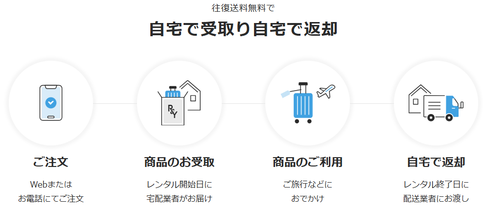 1番の大きなメリットは、すべてのスーツケースから自宅で受取・返却可能で、往復送料が無料であることです。