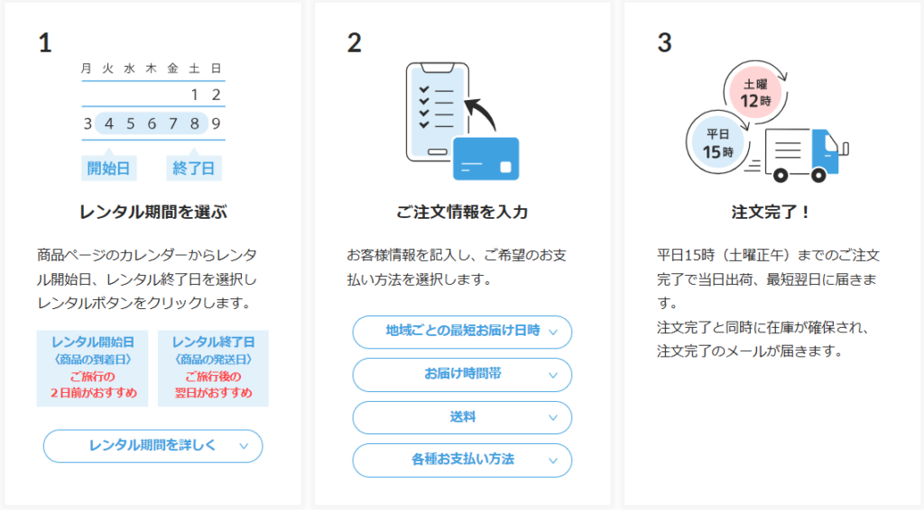 レンタル開始日は、荷物の準備を開始する日を含むので、旅行開始日を選ばないようにしましょう。レンタル終了日も同様で、帰宅日ではなく、片付けが終わって返却できる日を選択します。