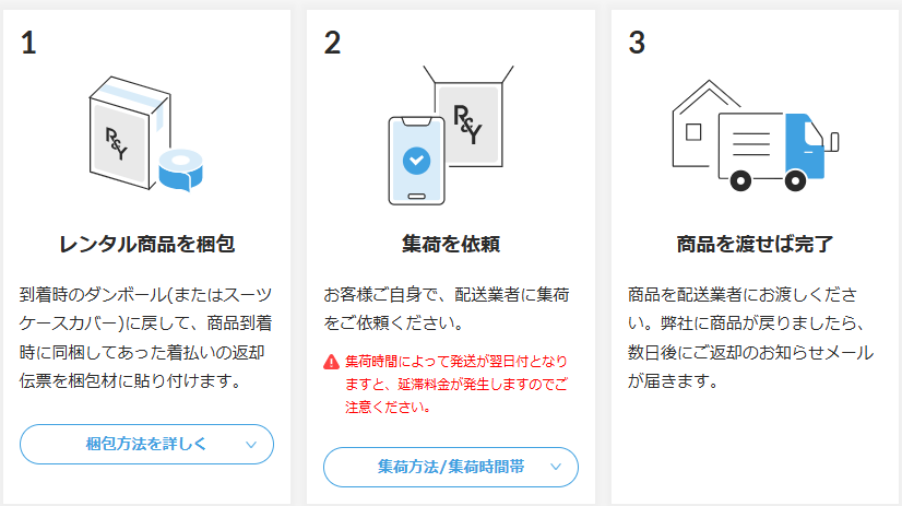 返却時には、受取時にもらったボックスに入れて、配送業者に集荷を依頼します。